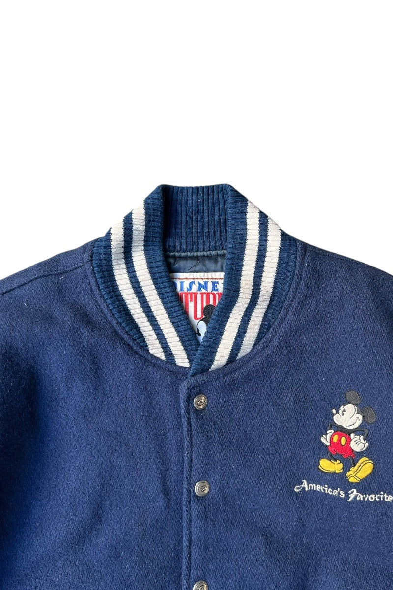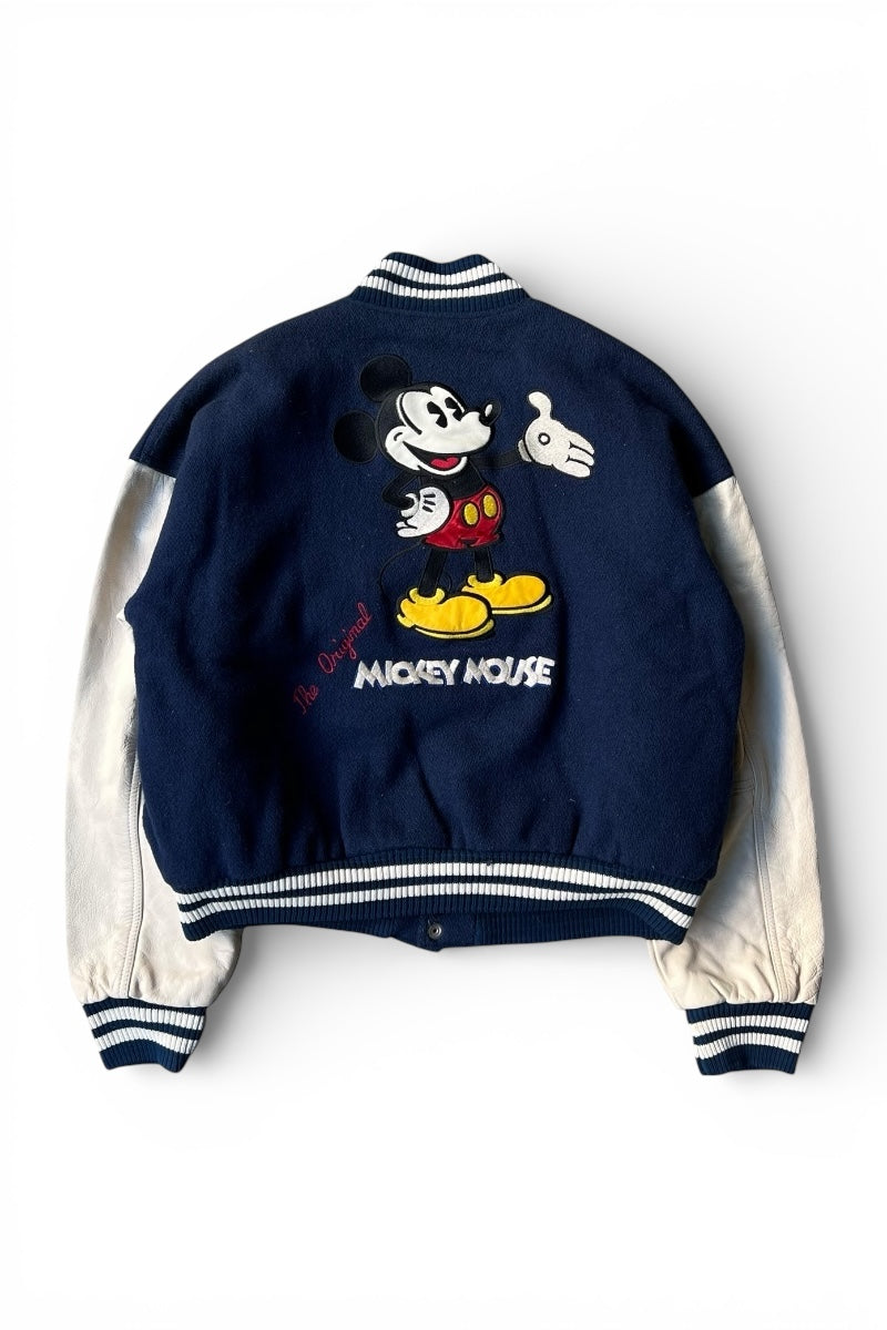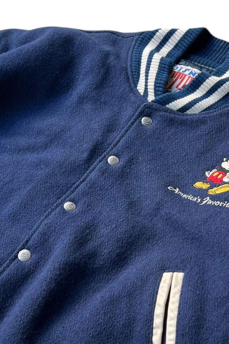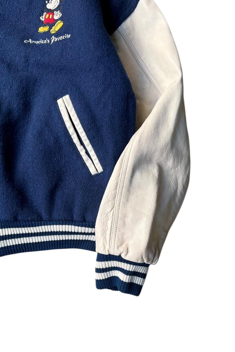 MADE IN USA 90'S MICKEY WOOL LEATHER STADIUM JACKET W/QUILTING LINER / NAVY [SIZE: S USED]